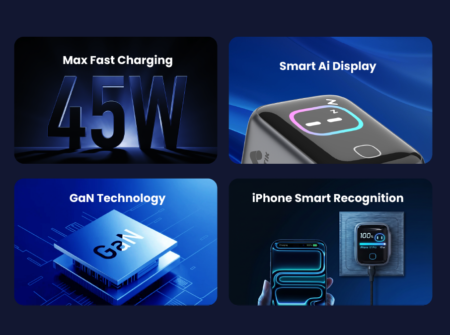 * Ultra-Compact 45W GaN Power: High-speed charging in a miniature size using Gallium Nitride technology for higher efficiency and cooler operation
